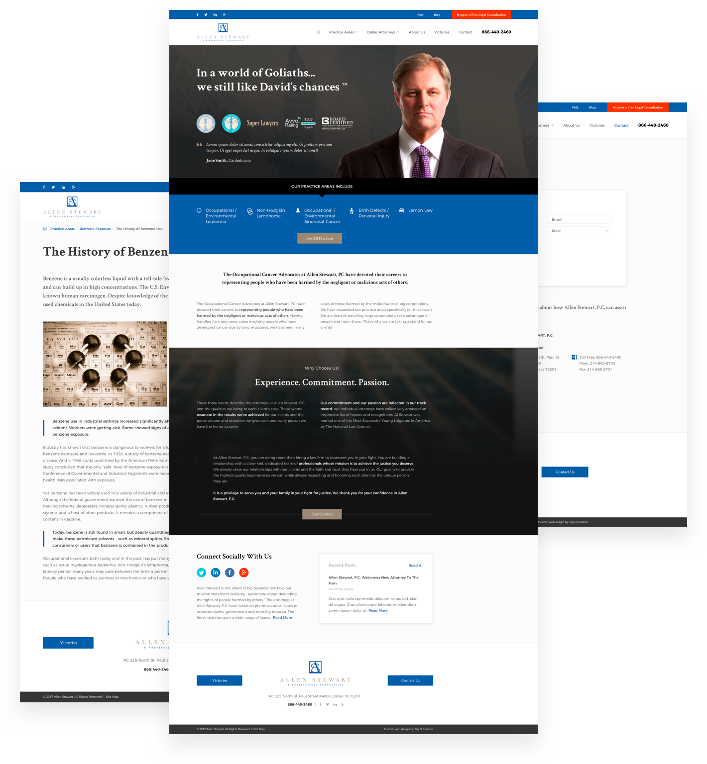 This web design and development project was the second of two websites that Dallas SEO Dogs built for Dallas law firm Allen Stewart. This WordPress site provided a new look and feel with a better flow and navigation. We focused on a better design for all pages to maximize conversions. The site was specifically designed for the client’s target audiences, including those injured by products or an environment, as well as lemon law cases (breach of warranty). We provided several trust badges, client quotes and recent case results to help clients make a decision to hire our client. As such, the site carries a tough, serious tone that is also blended with compassion and personality at points.