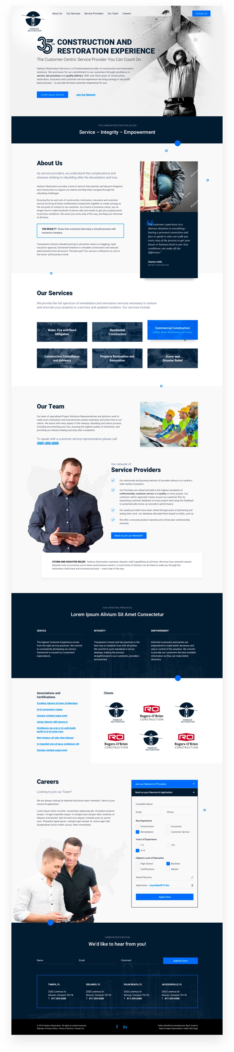 While this website has a similar scope as the J4 website, we had to make the look and feel completely different. So, we designed the website for Harbour Restoration’s broad target audience of residential, commercial, multifamily and military clients. We used a color scheme based on cool coastal colors. The design was modern and compatible with the company’s logo and branding. The content and images help to convey the focus of the company, which was to help rebuild the Bay County area following the devastation of hurricane Michael.