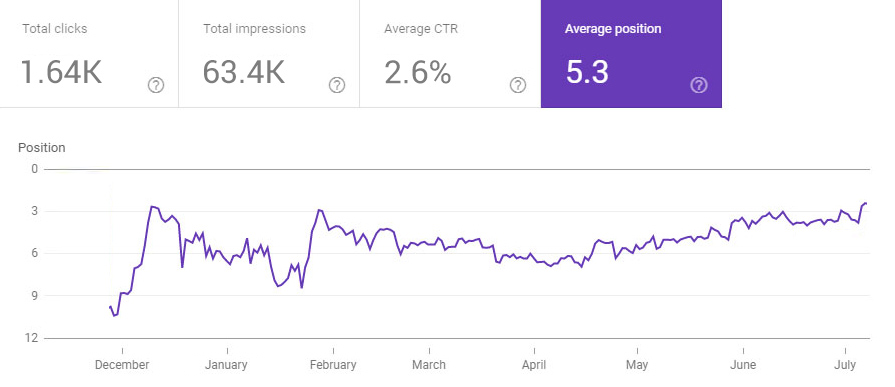 For the two target terms, HIDE saw an initial bump from our corrections, then a standard stabilization period, followed by steady increases in clicks and impressions in ensuing months. This is a typical improvement pattern, but dramatic improvement takes much longer for many clients. This is why we stress that “SEO takes time”.
